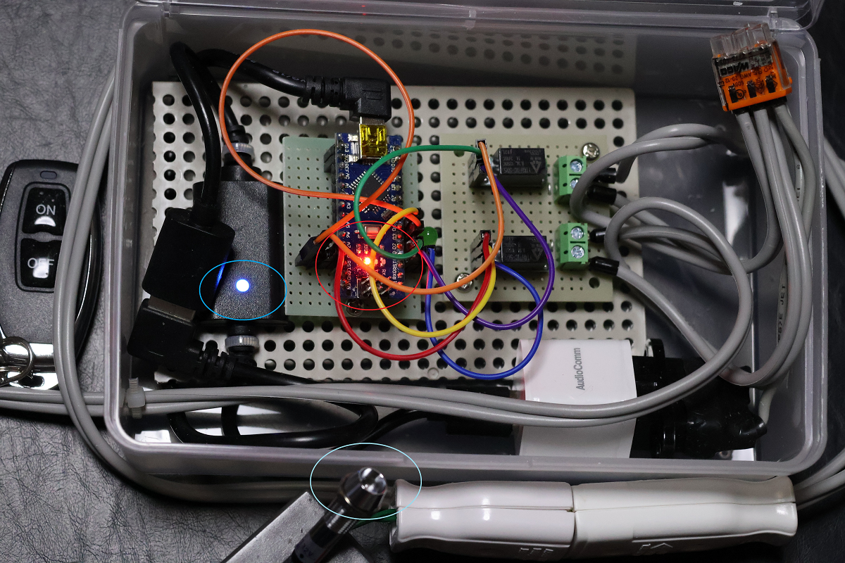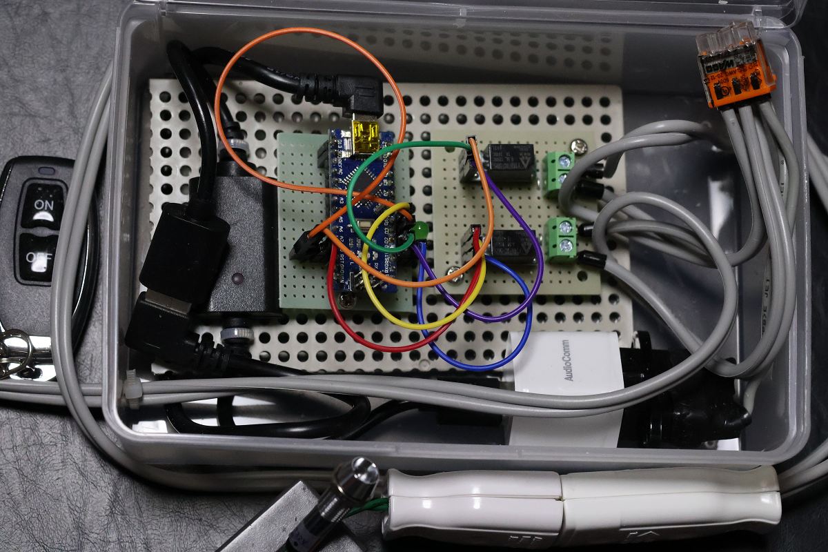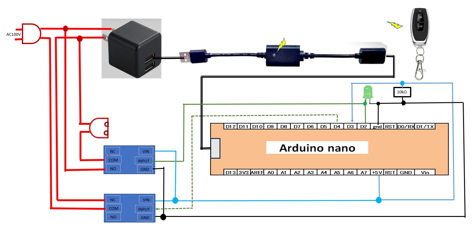 ![]() USB送信機のOFFボタンを押すことなく NCのリレーモジュールがHIGHとなるタイミングで USB受信機は、OFF Aruduino本体も OFF |